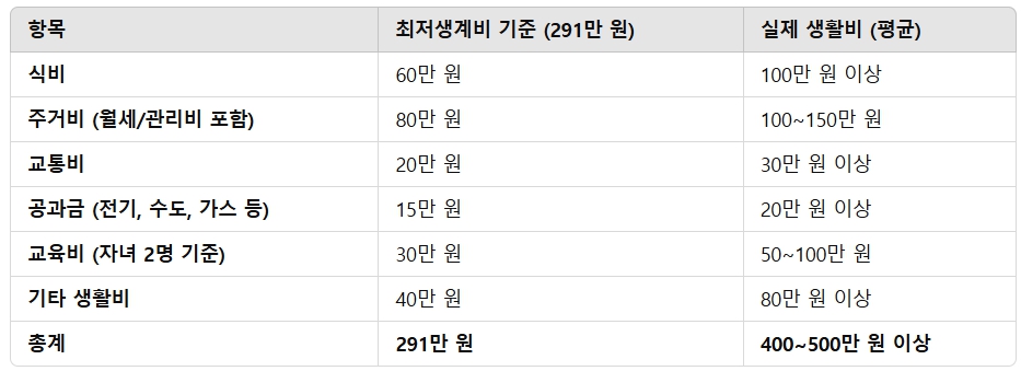 💡 "정부 기준 최저생계비보다 실제 생활비가 훨씬 많이 듭니다!"